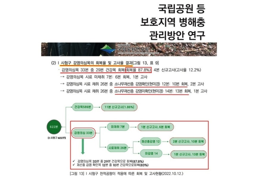 반면, 천적 곰팡이를 이용한 친환경 방제의 효과는 남이섬 외에 다른 곳에서도 확인됐다. '온 국민 농약 흡입 방치... 산림청이 은폐한 소나무 주사의 실체'(2023.03.29.) 기사에 밝힌 바와 같이 환경부 산하 국립공원공단의 현장 실험 결과에서도 재선충 예방은 물론, 재선충에 감염되었던 소나무가 치료 회복되었음을 입증했다. 그 이후로도 다양한 현장에서 동일한 실험 결과들이 나오고 있다.