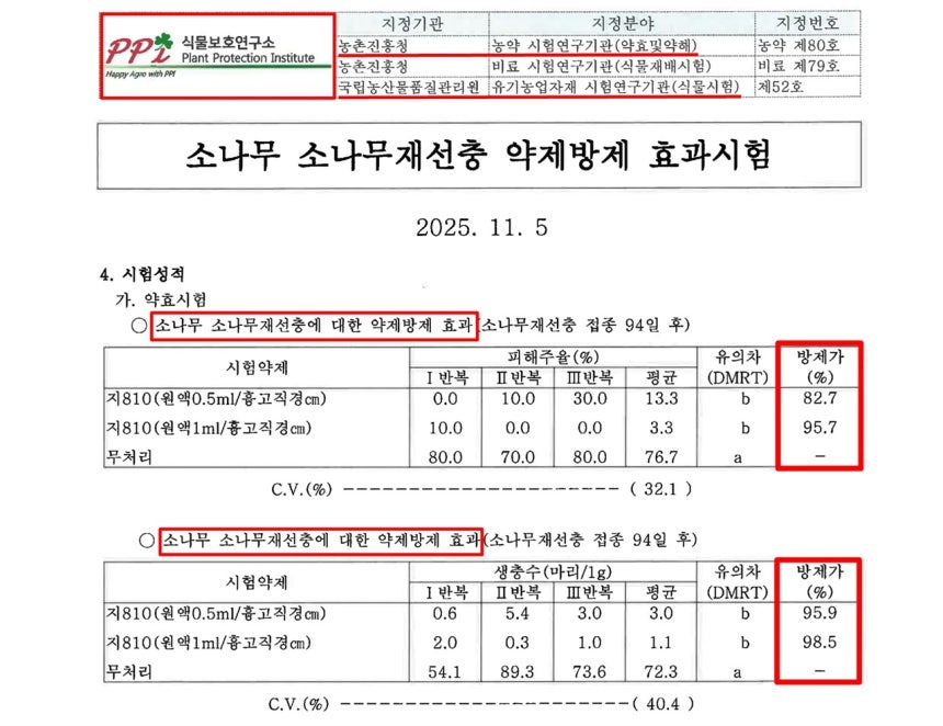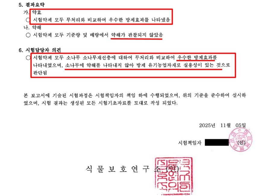 남이섬뿐만 아니라 국립공원공단의 여러 시험 현장에서 천적 곰팡이의 재선충 방제 효과가 입증되고 있다. 이뿐 아니다. '식물보호연구소'가 지난 11월 5일 작성한 천적 곰팡이의 친환경 방제재의 효과 시험 결과 보고서를 입수했다. 식물보호연구소는 농촌진흥청의 농약시험기관이며, 국립농산물품질관리원으로부터 유기농자재 시험연구기관으로 인정받은 기관이다.