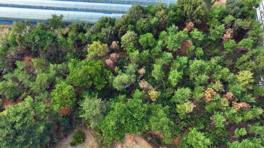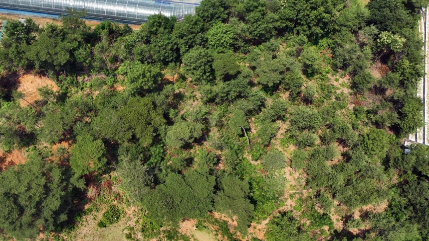 논산시 연산면의 10월 모습. 재선충 주입한 무처리구의 소나무들은 대부분 고사했으나, 천적 곰팡이를 먼저 주입하고 재선충을 주입한 소나무들은 재선충을 잡아 먹고 이겨냈다.