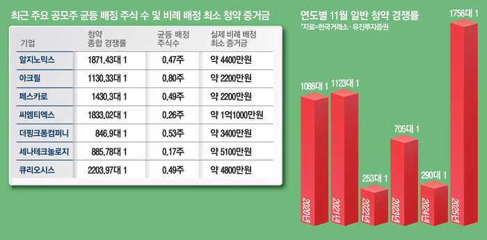 “알지노믹스는 2000만원을 넣어 겨우 1주를 받았고, 아크릴도 1800만원을 납입해 딱 1주를 받았어요. 상장 첫날에 받아서 연말에 오마카세 외식이라도 해볼까 했는데, 어림도 없네요.” (30대 개인투자자 홍 모씨)