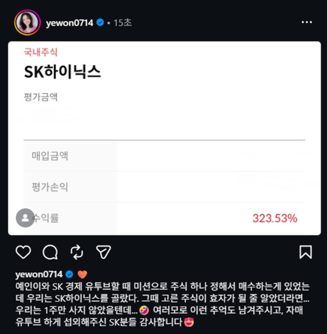 장예원은 7일 인스타그램 계정에 “예인이와 SK 경제 유튜브할 때 미션으로 주식 하나 정해서 매수하는게 있었는데 우리는 SK하이닉스를 골랐다. 그때 고른 주식이 효자가 될 줄 알았더라면… 우리는 1주만 사지 않았을텐데… 여러모로 이런 추억도 남겨주시고, 자매 유투브 하게 섭외해주신 SK분들 감사합니다”라고 적었다.