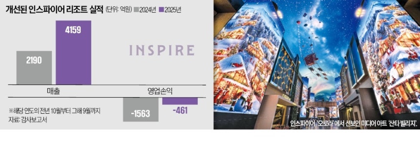 8일 금융감독원 전자공시에 따르면 인스파이어의 지난해(2024년 10월~2025년 9월) 매출은 4159억원으로 전년(2190억원) 대비 90% 급증했다. 수익성도 크게 개선됐다. 영업적자는 1563억원에서 461억원으로 3분의 1 수준으로 줄었다. 당기순손실도 2654억원에서 1548억원으로 1000억원 이상 덜어냈다. 법인세·이자·감가상각비 차감 전 영업이익(EBITDA)은 169억원으로 흑자 전환했다.