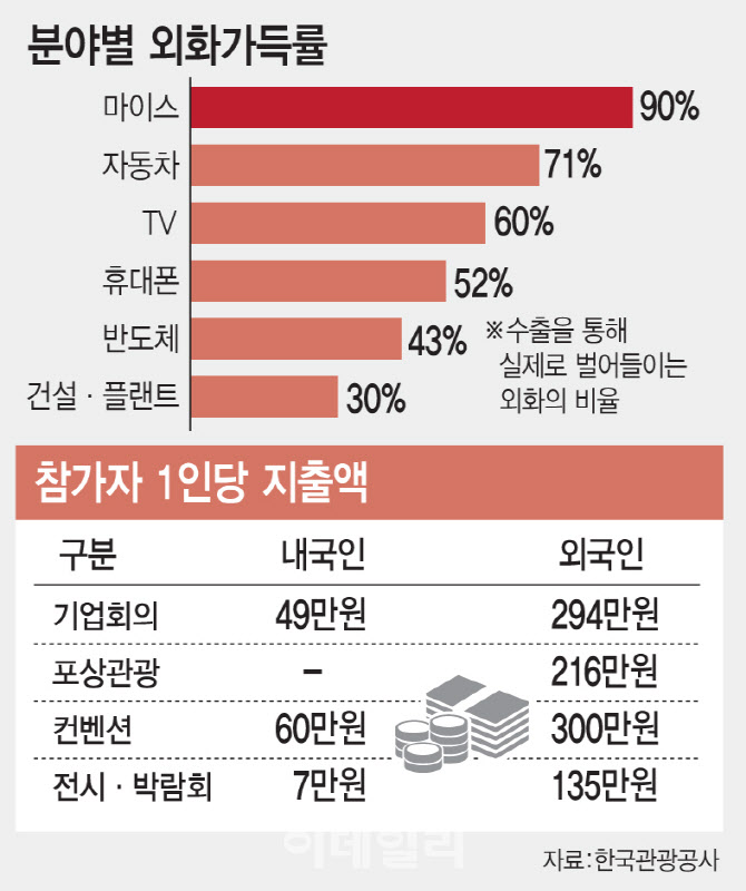 마이스는 그동안 90%에 달하는 높은 외화가득률에도 ‘번외’ 수출 산업으로 분류됐다. 외화가득률만 놓고 보면 자동차(71%), TV(60%), 반도체(43%), 건설·플랜트(30%)보다도 높다. 2023년 마이스 목적 방한 외국인(153만 명)의 총소비액 4조 5000억 원에 외화가득률을 적용한 실질 수입은 약 4조 원. 단 8%인 외국인(기업) 참가 비중을 싱가포르, 홍콩과 같은 40%까지 높이면 지금보다 5배 많은 20조 원의 수출 효과를 얻을 수 있단 얘기다.