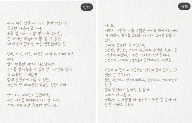 또한 다니엘은 팬들을 향해 "모든 걸 지금 다 말할 수는 없지만, 내 마음이 향하는 곳은 변함없다"고 밝히며, 불확실한 상황 속에서도 흔들리지 않는 마음을 전했다. 그는 "힘든 순간도 '불가능'이 아니라 '조금 더 시간이 필요한 순간'일 뿐"이라며 스스로를 다독이듯 글을 마무리했다.