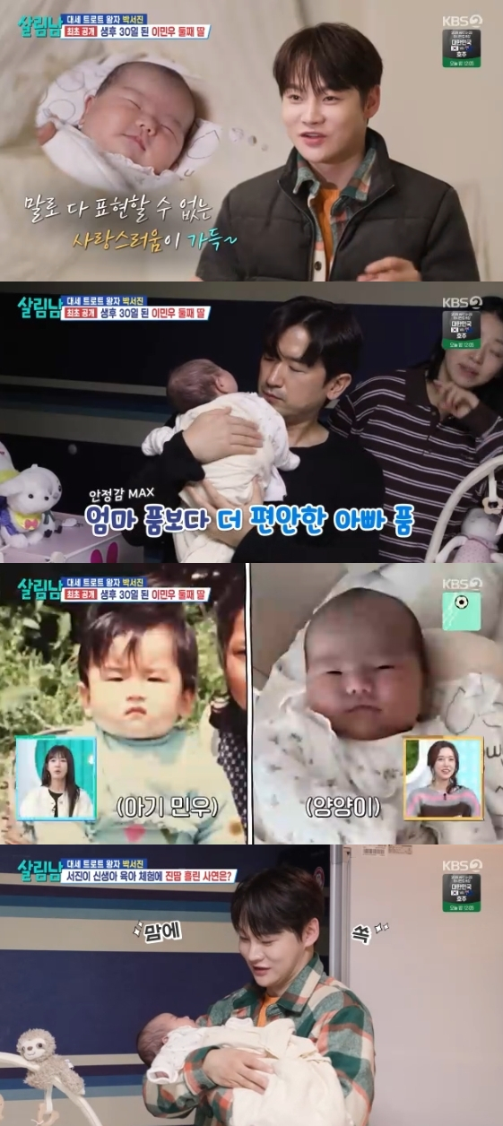 이때 이민우는 능숙하게 신생아를 안으며 어엿한 아빠의 모습을 선보였고, 이민우의 아내는 "안정감이 있어서 저보다 편하게 대하는 것 같다"라고 추켜세웠다.