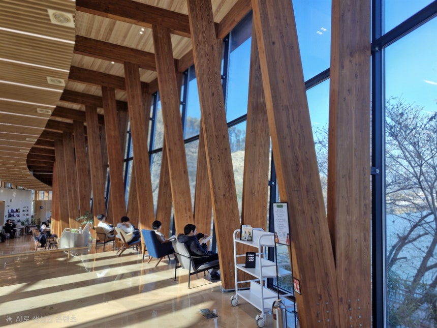 안으로 들어서자 따뜻한 온기가 얼굴을 만진다. 동시에 '왐마!' 감탄이 터졌다. 천장이며 서가, 창가에 설치한 기둥까지 목재 마감이어서 심리적 긴장감이 해체되는 분위기다. 곡선의 흐름이 부드러워 '편히 쉬다 가라'고 말하는 것 같아 마음이 느슨해지는 듯했다.