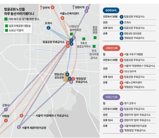 한국일보는 지난 연말 2주간 탑골공원 인근에서 노인 20여 명을 만나 그들의 일상을 추적했다. 탑골 노인들의 일상은 반년 전보다 훨씬 외롭고 파편화돼 있었다. 지하철, 대형 종교시설 등 시선이 집중되지 않는 곳에 홀로 숨어들었고, 하루 일과 전체를 무료급식에 맞춰 재편하기도 했다.