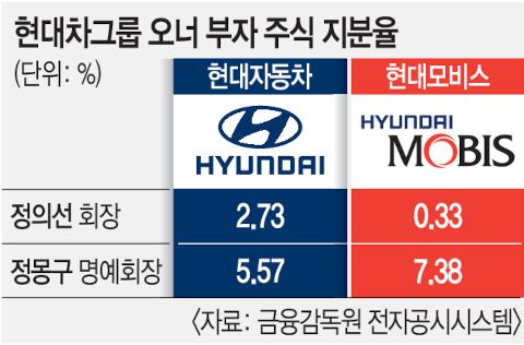 21일 금융감독원 전자공시시스템에 따르면 정 회장이 보유한 현대차 지분은 559만8478주로 2.73%에 그친다. 와병 중인 부친 정몽구 명예회장이 보유한 지분 5.57%를 합쳐도 8.3%에 불과하다. 현대차 최대 주주는 지분 22.36%를 가진 현대모비스다. 그룹 계열사인 현대모비스가 현대차의 지주회사 역할을 하는 것이다.