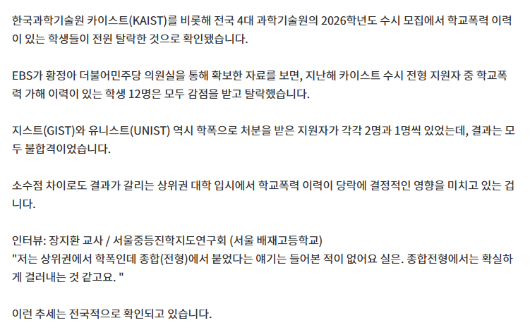 [단독] "성적 좋아도 소용없다"…KAIST도 학폭 지원자 전원 탈락