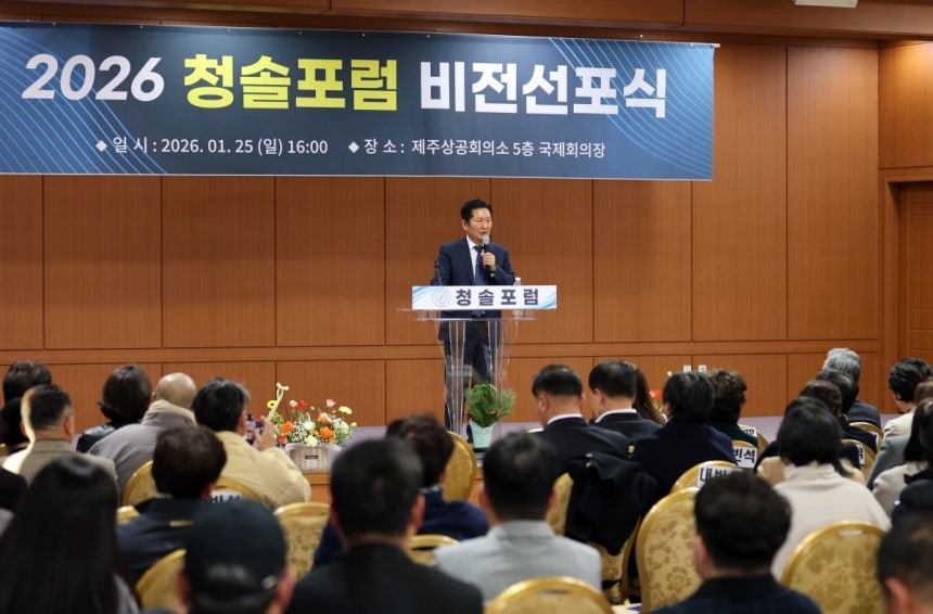 정청래 더불어민주당 대표가 25일 오후 4시 제주 도남동 제주상공회의소에서 열린 '청솔포럼 비전선포식'에서 자신의 개인사와 학생운동 시절 기억을 풀어냈다. 충남 금산에서 10남매 중 막내로 태어난 정 대표는 이날 특별 강연에서 학창시절, 가족사를 차례로 꺼내며 "민주주의는 누군가 대신 지켜주는 제도가 아니라 이렇게 살아낸 사람들의 축적"이라고 강조했다. 이날 강연 내용은 본래 주제인 '이재명 정부 성공을 위한 시민의 역사적 책무'보다는 '정치인 정청래의 자기 생애 보고'에 가까웠다.