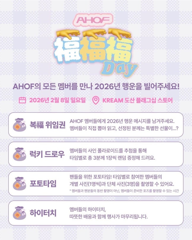 ’복 위임권’ 코너도 마련했다. ‘2026년 아홉 멤버에게 내려주고 싶은 복'을 미리 작성, 팬들이 멤버들에게 직접 '복'을 전하는 이벤트다. 멤버들은 직접 손글씨 부적을 써서 복을 다시 나눠줄 계획이다.