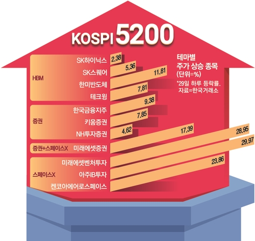증권 대장주인 미래에셋증권은 스페이스X 테마까지 겹치며 17.39% 급등했다. 스페이스X가 오는 6월 상장을 추진 중이라는 소식이 전해지자 초기 투자에 참여한 아주IB투자와 미래에셋벤처투자의 주가도 각각 29.97%와 28.95% 치솟았다. 스페이스X의 벤더사로 알려진 켄코아에어로스페이스 역시 23.86% 상승했다.