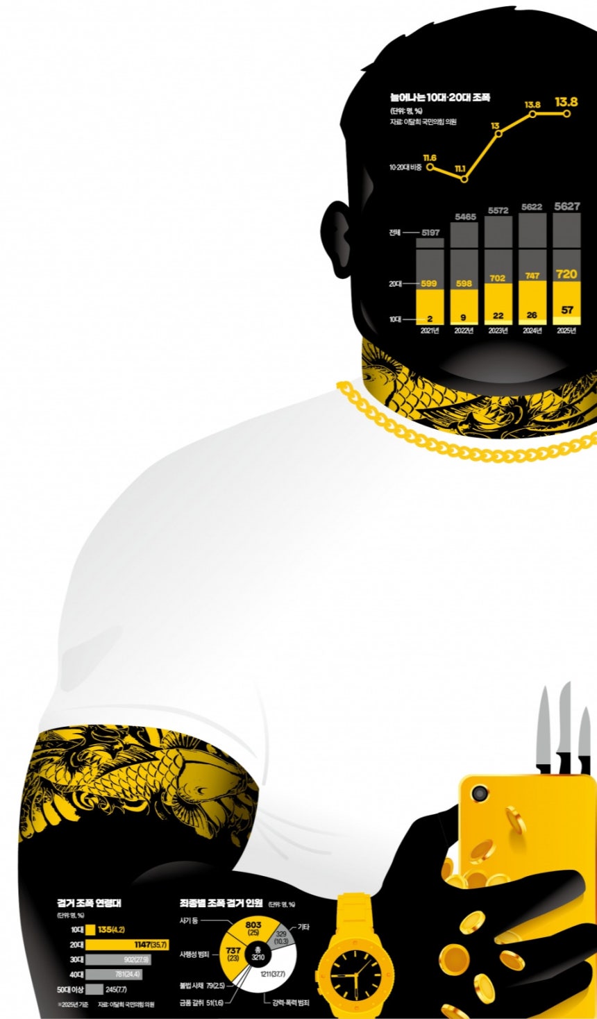 지난해 기준 10대와 20대가 전체 조폭 인원에서 차지하는 비중은 13.8%로, 4년 전(11.6%)보다 2.2%포인트 상승했다. 조폭 100명 중 10대와 20대는 14명 정도인 셈이지만, 범죄 현장에서 이들의 존재감은 그보다 훨씬 크다. 기존 조직원들이 고령화하면서 실제 범행을 주도하는 세대가 젊은 층으로 옮겨가고 있어서다. 지난해 전국에서 검거된 조폭 3210명 가운데 10·20대는 1282명으로, 전체의 약 40%를 차지했다.