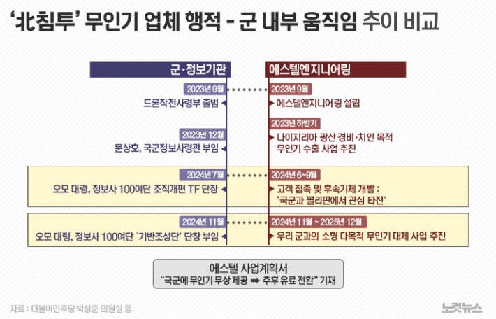 북한에 무인기를 보낸 혐의로 수사를 받고 있는 민간 업체 에스텔엔지니어링(에스텔)이 2024년 6월 전후로 우리 군과 접촉한 뒤 본격적으로 군용 무인기 사업을 추진한 정황이 포착됐다. 에스텔은 사업 초기 나이지리아를 상대로 사업을 추진한다고 했었는데, 2024년 중순부터 돌연 국내 사업으로 눈을 돌린 것이다.