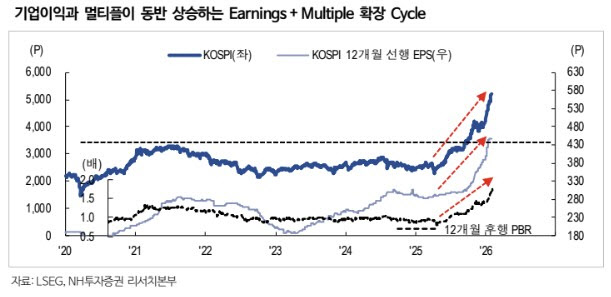 김병연 NH투자증권 연구원은 이날 보고서에서 “지수 변동성이 높음에도 코스피 목표치를 상향 조정하는 이유는 현재 주식시장이 기업이익 증가와 멀티플 확장이 동시에 진행되는 ‘어닝(이익)+멀티플 확장’ 국면이기 때문”이라며 이같이 밝혔다.
