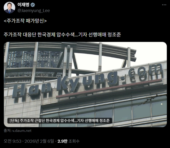이 대통령은 오늘(6일) 엑스(옛 트위터)에 합동대응단이 한국경제신문 본사를 압수수색했다는 기사를 공유하면서 "주가조작 패가망신"이라고 적었습니다.