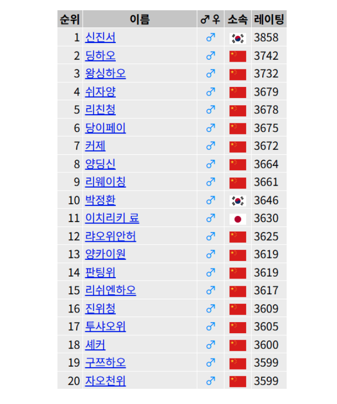 전세계 바둑 랭킹 20위 중에 17명이 중국인.