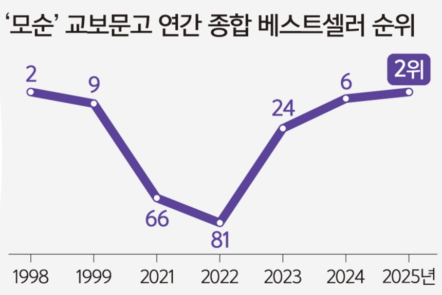 먼저 ‘모순’의 판매 추이를 더 세밀하게 살펴볼 필요가 있어 보였다. 교보문고에 확인한 결과, 양귀자의 ‘모순’은 살림출판사에서 발표된 1998년 무려 40만부가 팔리며 종합 베스트셀러 2위를 차지했고, 이듬해에 9위를 기록한 뒤 순위에서 사라졌다. 한동안 절판됐던 책은 2013년 쓰다출판사로 옮겨 개정 출간됐고, 팬데믹(감염병 세계적 대유행)이 강타한 2020년부터 조용히 입소문이 나면서 독자들이 다시 찾기 시작했다. 2021년 종합 베스트셀러 순위 66위로 재등장한 뒤, 2022년 81위, 2023년 24위, 2024년 6위로 꾸준히 상승한 끝에 지난해 2위까지 오르며 정상 턱밑까지 육박했다.