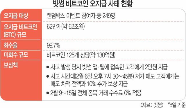 빗썸은 잘못 지급된 비트코인 가운데 99.7%를 사고 당일 회수했다. 또 오지급된 금액 회수를 위해 미반환 이용자를 특정해 접촉 중이다. 이미 매도된 미회수 물량 0.3%(비트코인 125개 상당)에 대해선 회사 보유자산을 투입해 고객 예치 자산과 거래소 보유 자산 간 100% 정합성을 확보했다는 입장이다.
