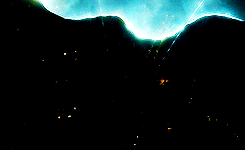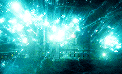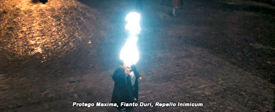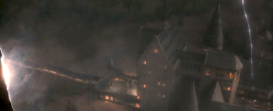 밖에 있던 죽음을 먹는 자들이 호그와트를 향해 주문을 쏘면서 빛이 터지는 장면