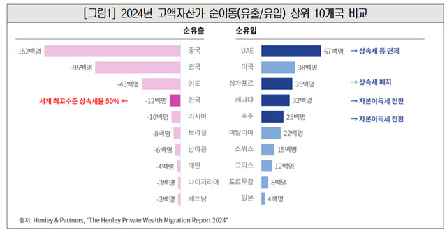 “높은 상속세 부담으로 인해 기업뿐 아니라 국민의 국적 이탈도 현실화되고 있다. 영국의 투자이민 컨설팅사 헨리앤드파트너스(Henley & Partners)에 따르면 2024년 100만달러 이상 순자산 보유자의 국적 순유출 규모에서 한국은 1200명으로 중국(1만5200명), 영국(9500명), 인도(4300명)에 이어 4위를 기록했다. 인구 대비로는 영국 다음으로 많은데 2016년 브렉시트로 자산가 유출이 지속되는 영국을 제외하면 사실상 세계에서 가장 높은 수준이다.”(2025년 4월11일 대한상의 보도자료)