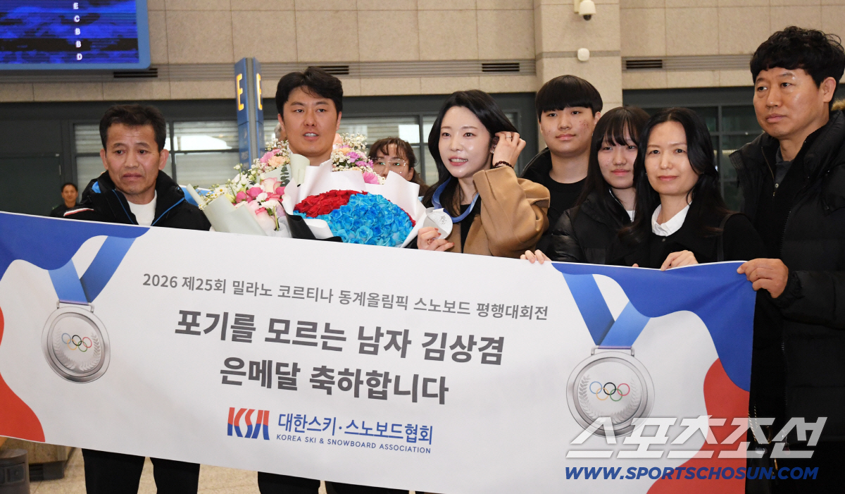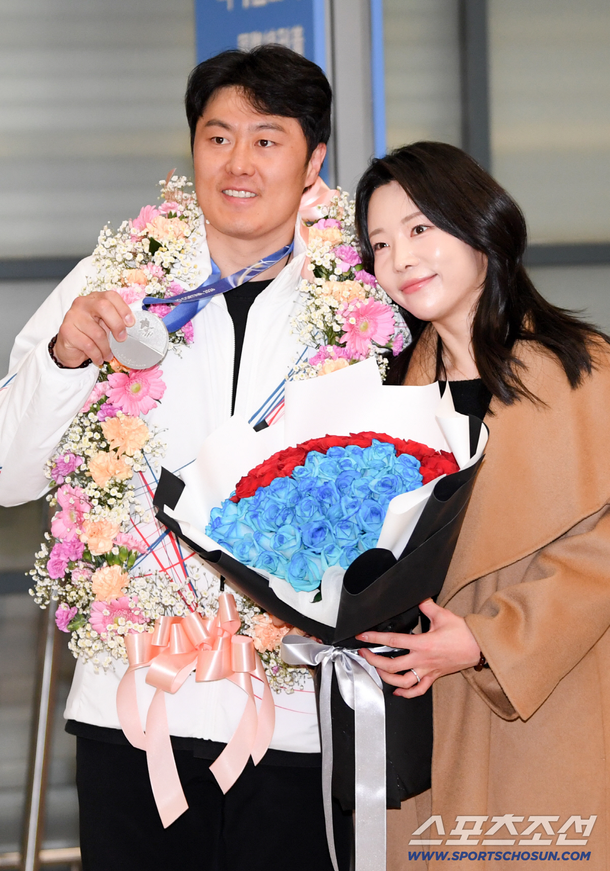 2026 제25회 이탈리아 밀라노 코르티나담페초 동계올림픽에서 은메달을 획득한 스노보드 국가대표 김상겸이 10일 인찬국제공항을 통해 귀국했다. 김상겸이 아내와 함께 포즈를 취하고 있다.