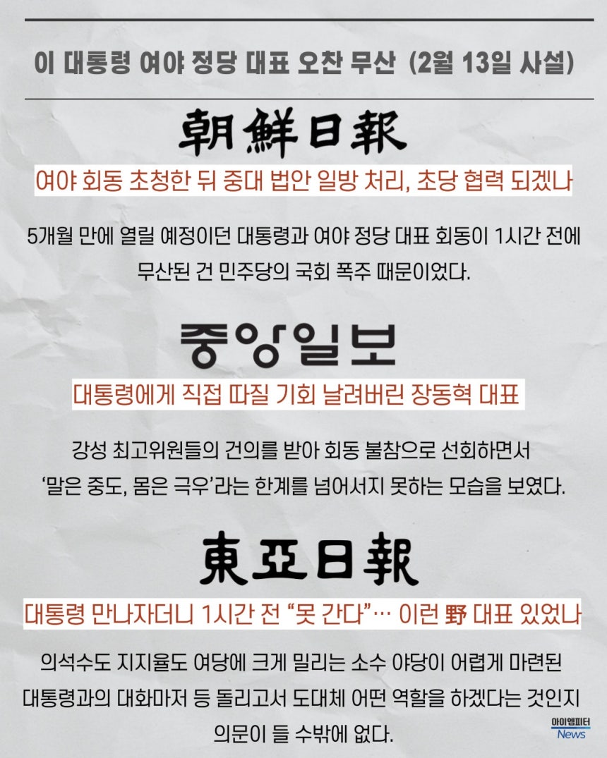 보수 언론인 <조선일보>, <중앙일보>, <동아일보>는 13일 사설을 통해 일제히 장 대표의 결정을 비판했습니다. 민주당의 입법 독주를 문제 삼으면서도, 제1야당 대표가 약속된 회동을 1시간 전에 깬 것은 정치적 패착이라는 지적입니다.