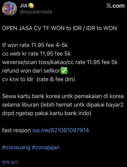 자신을 '지아(JIA)'라고 밝힌 외국인 사용자의 게시글. 해당 내용에서는 인도네시아 루피아(IDR)을 한국 원화(KRW)로 환전해줄 수 있다고 적었으며, 한국 방문 시 사용할 수 있는 한국 은행 카드를 대여해줄 수 있다고 적었다. 아래쪽에는 한국 국적 번호인 '82'로 시작되는 휴대전화번호가 적혀있다./엑스(X·옛 트위터 갈무리)