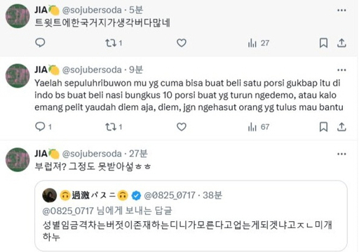 19일 글로벌 사회관계망서비스(SNS) 엑스(X·옛 트위터)에 따르면 최근 국내 사용자들 사이에서 한국어와 인도네시아어를 사용하는 한 계정의 '혐한' 게시글이 확산했다. 이달 중순부터 일부 인도네시아 국적 누리꾼들이 '혐한' 게시글을 작성하며 국내 누리꾼들과 갈등을 빚는 가운데, 본인을 '지아(JIA)'라고 밝힌 한 계정이 자신이 한국 내 시중은행에서 일한다고 밝힌 게시물을 작성했던 것으로 확인돼서다.