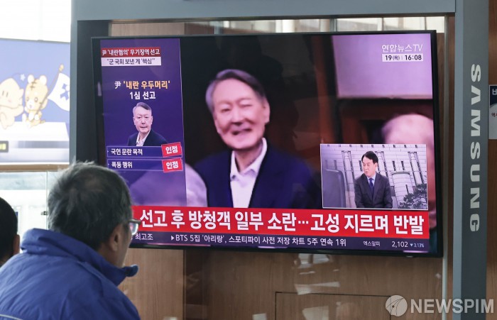 19일 오후 서울역을 찾은 시민들이 12·3 비상계엄 내란 우두머리 혐의로 기소된 윤석열 전 대통령의 1심 무기징역 선고방송을 시청하고 있다. 서울중앙지법 형사합의25부(지귀연 부장판사)는 이날 417호 대법정에서 윤 전 대통령의 내란 우두머리 혐의에 대해 444일만에 특검의 구형에 못미치는 무기징역을 선고했다.