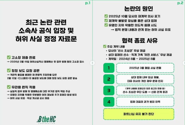 더불어 "이번 논란은 계약 종료(2025년 8월)에 앙심을 품은 상대 업체가 시도한 악의적 음해의 결과"라며 무상 서비스 편취 및 갑질 의혹, 차량 서비스 이용, 홍보 의무 등과 관련한 업체의 주장에 반박했다.