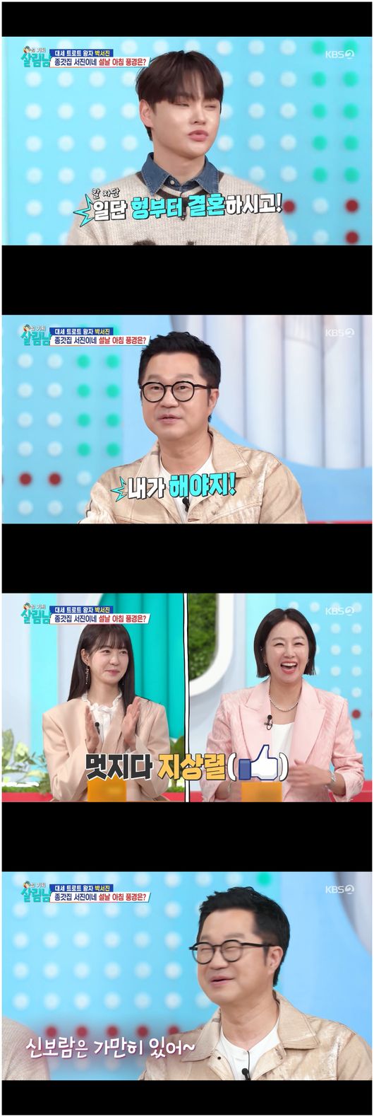 이어 제사를 지내는 박서진 부자의 모습이 그려졌다. 은지원은 “지상렬은 제사나 그런 게 있냐”라고 물었다. 지상렬은 “당연히 제사, 차례 다 있다”라고 말했다. 박서진은 “그럼 신보람 님 결혼하시면 다하셔야 하는 거냐”라며 깜짝 놀랐다.