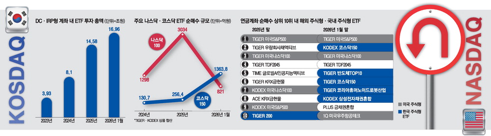 올 들어 1월 말까지 미래에셋 DC·IRP형 계좌에서 연금 투자자들이 가장 많이 사들인 ETF 순매수 상위 10개 종목을 집계한 결과, 국내 주식형 ETF 5개가 포함됐다. 10위권 내에 국내 주식형 상품이 단 한 개도 포함되지 않았던 2024년, 1개(TIGER 200·10위)에 그쳤던 2025년과 비교하면 큰 변화다. 구체적으로 살펴보면 올 들어 1월 말 기준 순매수 2위와 6위에 KODEX 코스닥150(859억원)과 TIGER 코스닥150(504억원)이 각각 이름을 올렸다. 이 밖에도 TIGER 반도체TOP10(5위), TIGER 코리아휴머노이드로봇산업(7위), KODEX 삼성전자채권혼합(8위) 등 국내 투자 상품이 대거 10위권에 포함됐다. 이들 5개 상품의 1월 순매수 금액만 3000억원에 달한다.
