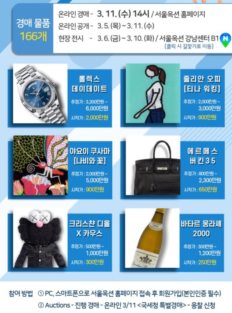 추정가 3200만-6000만 원인 롤렉스 데이데이트 시계는 시작가 2000만 원이 책정됐고, 에르메스 버킨35는 800만-2300만 원 상당 이지만, 시작가는 650만 원이다.