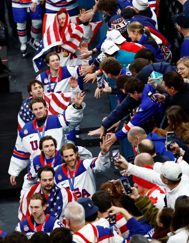 아이스하키 대표팀은 2026 밀라노·코르티나 동계올림픽에서 극적인 우승을 거둔 뒤 워싱턴 D.C.를 찾아 국정연설에 참석했다. 하원 방청석에 자리한 선수들이 소개되자 의회장에는 "U-S-A" 연호와 함께 기립 박수가 쏟아졌다.