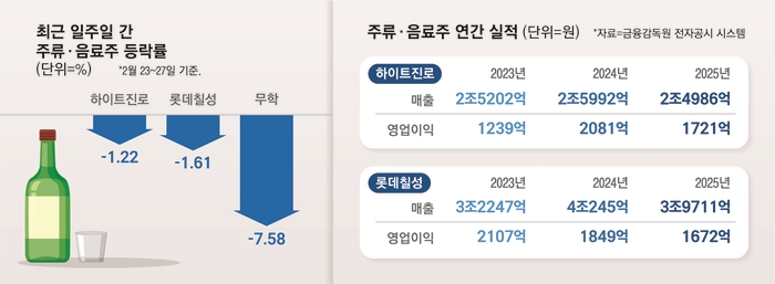 내수 소비 둔화와 절주 문화 확산으로 주류 및 음료 수요가 급감하면서 관련 업종 주가가 약세를 보이고 있다.