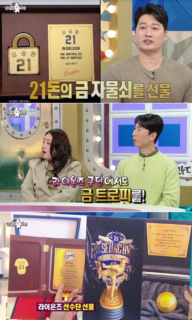 이날 방송에서는 오승환이 선수 생활 동안 받은 ‘금 선물’ 이야기가 화제가 됐다. 오승환은 “21번이라는 번호 덕분에 은퇴할 때 21돈짜리 금 자물쇠를 선물 받았다”며 “구단에서도 금 트로피를 제작해줬다”고 말했다.