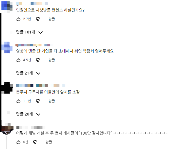 그는 100만 구독자 달성 이후 유튜브 커뮤니티에 “구독자 100만 감사합니다. 궁금한 것을 댓글에 남겨달라”는 글을 남겼다. 이에 누리꾼들은 “민원인으로 청주시청 방문 할 것이냐”, “충주시 공식 채널 구독자를 앞지른 소감이 궁금하다”, “사직서를 낸 뒤 가장 달콤했던 제안은 무엇이었나” 등 다양한 질문을 쏟아내고 있다.