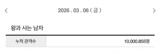 '왕과 사는 남자'가 개봉 31일째인 3월 6일(금) 오후 6시 32분경 누적관객수 1,000만 명을 돌파했다. '왕과 사는 남자'는 전국적인 사극 흥행 신드롬을 일으켰던 '왕의 남자', '광해, 왕이 된 남자', '명량'에 이어 역대 네 번째 사극 천만 영화에 등극하며 2026년 최고 흥행작다운 폭발적인 인기를 입증했다. 또한, 2024년 개봉한 '범죄도시4' 이후 2년 만의 천만 영화 탄생을 알리며, 극장가에 활력을 불어넣고 있다.