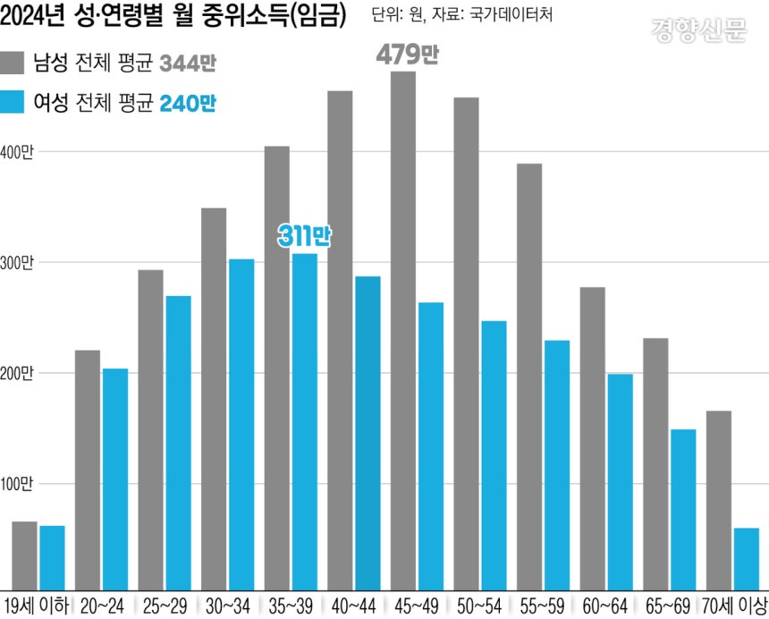 경향신문이 8일 국가데이터처의 ‘2024년 임금·근로 일자리 소득(보수)’ 자료를 분석한 결과, 2024년 기준 직장인 여성의 한달 중위소득은 240만원으로 남성(344만원)보다 104만원(30.2%) 적었다. 여성은 20대부터 70세 이상까지 모든 연령대에서 남성보다 임금이 낮았다.