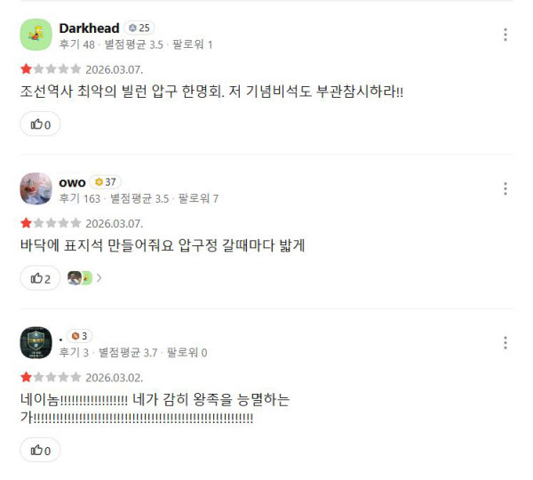 네티즌들은 “조선 역사 최악의 빌런 압구 한명회, 저 기념비석도 부관참시하라”, “바닥에 표지석을 만들어줘요, 압구정 갈 때마다 밟게” 등의 댓글을 남겼다. 또 다른 네티즌은 “네 이놈, 네가 감히 왕족을 능멸하는가”라는 극중 한명회를 향해 포효하는 단종의 대사를 댓글로 남겼다.