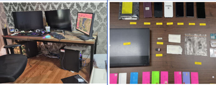 미얀마 사기 범죄 조직에서 탈퇴한 후 26세 남성들이 가담한 국내 자금세탁 조직의 사무실 모습. 오른쪽은 범죄 수익 세탁에 동원된 대포계좌와 대포폰 등. 서울동부지검 제공