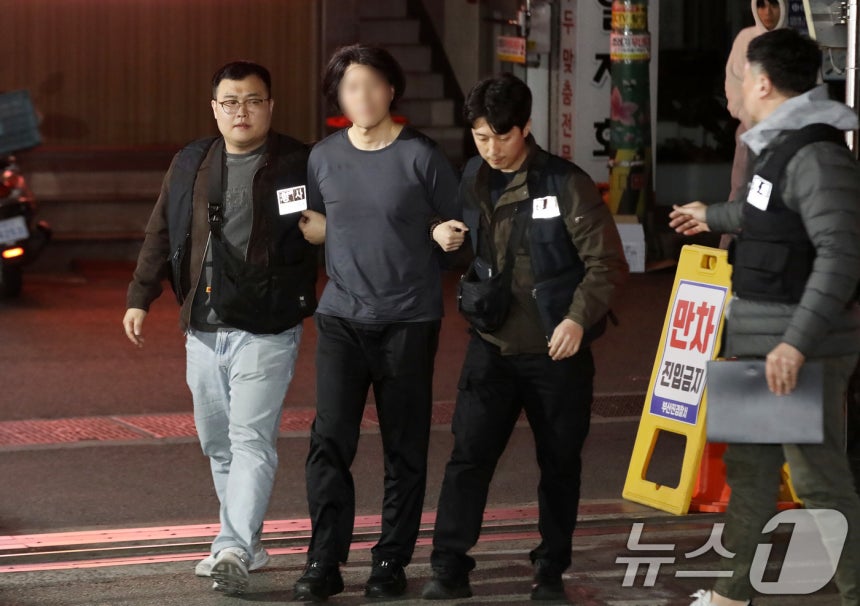 (부산=뉴스1) 윤일지 기자 = 부산의 한 아파트에서 항공사 기장을 흉기로 살해한 혐의를 받는 50대 피의자 A 씨가 17일 오후 부산진경찰서로 압송되고 있다.