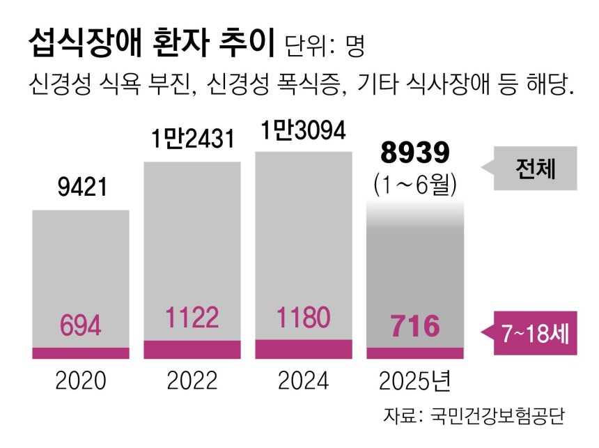 18일 국민건강보험공단에 따르면 섭식장애 환자 수는 2020년 9421명에서 2024년 1만3094명으로 4년 새 약 39% 늘었다. 지난해는 상반기(1∼6월)에만 8939명이 진료를 받았다. 지난해 전체로는 환자 규모가 1만7000명을 넘을 것으로 추산된다.