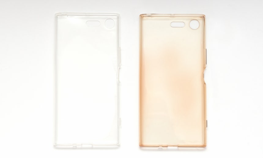 투명 스마트폰 케이스의 변색 전후 모습. 새 제품(왼쪽)과 달리 사용 후 케이스는 누렇게 변하는 ‘황변’ 현상이 나타난다. 사진=게티이미지뱅크