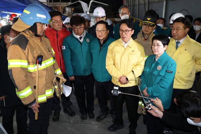 김민석 국무총리가 20일 화재가 발생한 대전 대덕구 문평동 자동차부품 제조 공장을 찾아 남득우 대전 대덕소방서장으로부터 화재 현황에 대해 보고 받고 있다. 공동취재