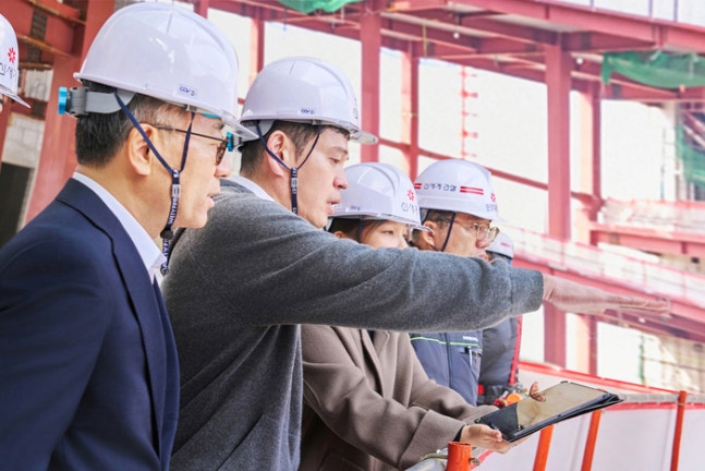 정용진 신세계그룹 회장(오른쪽에서 두 번째)이 23일 인천 청라국제도시에 조성 중인 ‘스타필드 청라’ 건설 현장을 찾아 진행 상황을 점검했다. 사진 | 신세계그룹