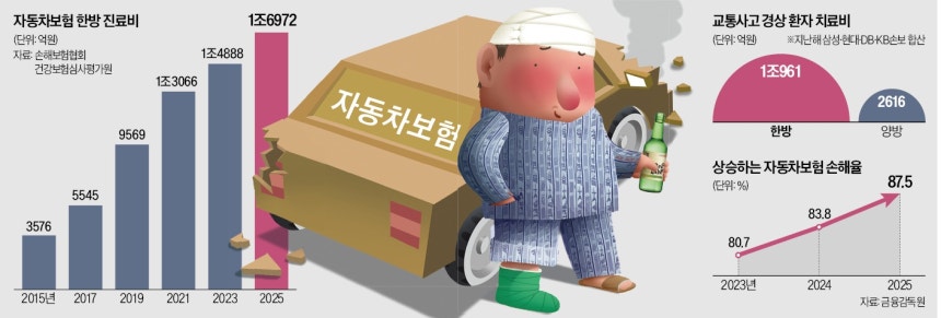 국내 자동차보험 가입자가 한의원과 한방병원에서 쓴 치료비가 10년 새 5배가량 증가한 것으로 나타났다. 경미한 교통사고 환자가 장기간 입원하거나 동일 증상에 침과 부항, 한약 처방을 한꺼번에 청구한 영향이다. ‘양방병원’으로 불리는 일반 병·의원에서 쓴 교통사고 진료비는 줄고 있어 한방 의료기관의 과잉진료가 자동차 보험료를 올리는 핵심 요인으로 지목되고 있다.