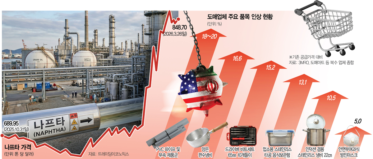 미국·이란 전쟁으로 원자재 가격과 물류비용이 급등하면서 국내 도매시장에서 유통되는 상당수 제품의 공급 단가가 일제히 오르기 시작했다. 가격 상승 품목은 포장재나 PVC 파이프 등 산업재는 물론 냄비나 프라이팬과 같은 소비재까지 망라하고 있어 연쇄 물가 상승을 불러올 것으로 전망된다.