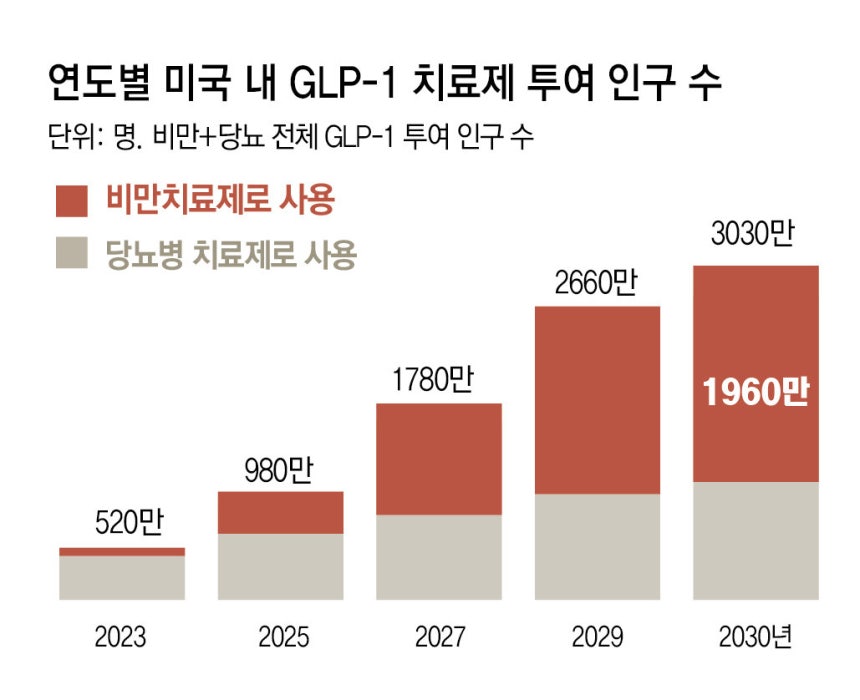 업계에서는 올해 제약사 간 경쟁으로 비만치료제 가격이 크게 떨어지고, 경구용 비만치료제가 등장하면 시장이 더 폭발적으로 확대될 것으로 본다. JP모건은 미국 내 GLP-1을 처방받는 환자가 2023년 520만 명에서 2026년 1290만 명으로, 2030년에는 3300만 명까지 빠르게 불어날 것이라고 전망했다. 더구나 전 세계 비만 인구의 약 33%가 거주하는 중국, 인도, 브라질, 캐나다, 터키 등 주요 시장에서 GLP-1 관련 특허가 만료돼 저가 복제약이 시판되면 GLP-1 이용 소비자가 폭증할 공산이 크다.